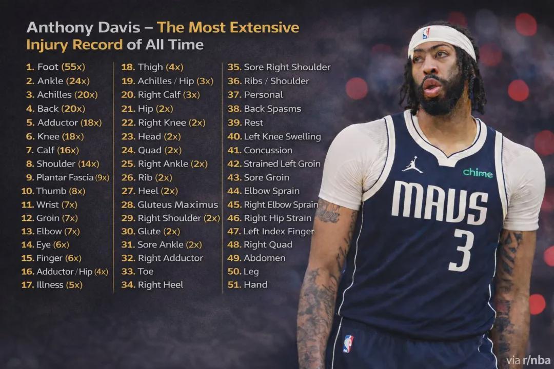 浓眉加盟独行侠之后,仅出战29场比赛,球队战绩16胜13负;他缺席了44场比赛,这期间球队12胜32负。下面这张图是浓眉生涯伤病汇总,总计51类伤情:足部伤势反复了55次;脚踝伤势反复24次;跟腱和背部伤势反复了20次……