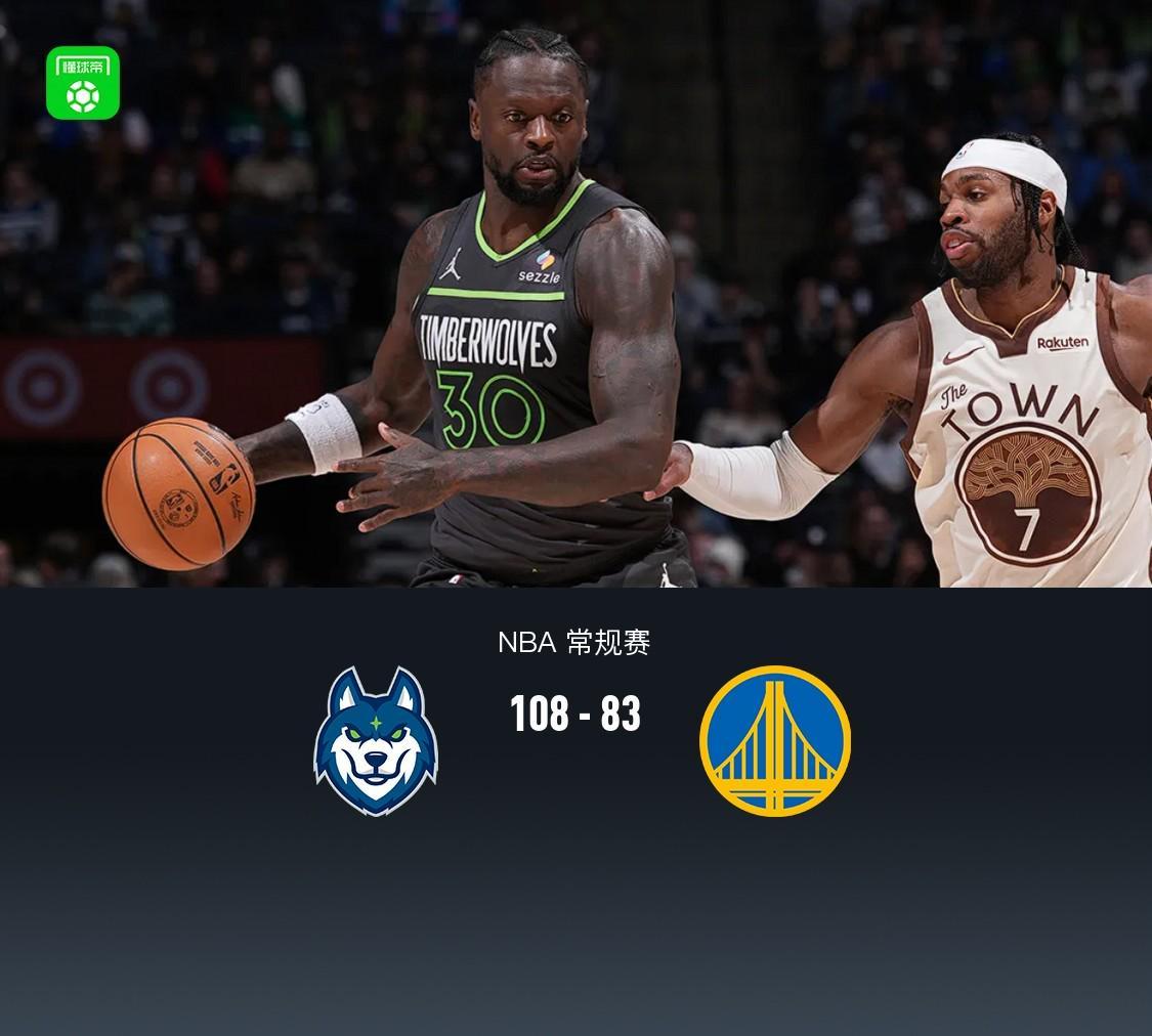 第四节,森林狼找到外线手感迪文琴佐三分不断持续拉大分差,节中便一度领先来到32分,后半节撤下主力进入练兵时间,全场结束,森林狼108-83战胜勇士。