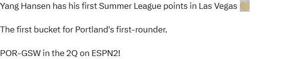 次节时刻,杨瀚森持球突破低手上篮得到个人夏联首分。而NBA官方也在社交媒体上晒出了此回合,庆祝杨瀚森得到首分。